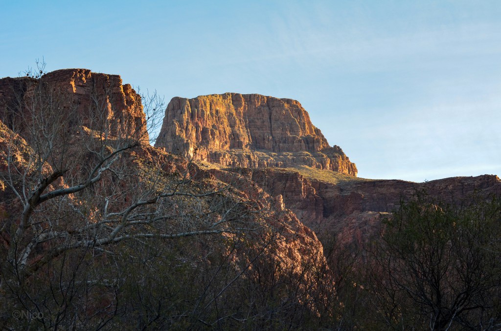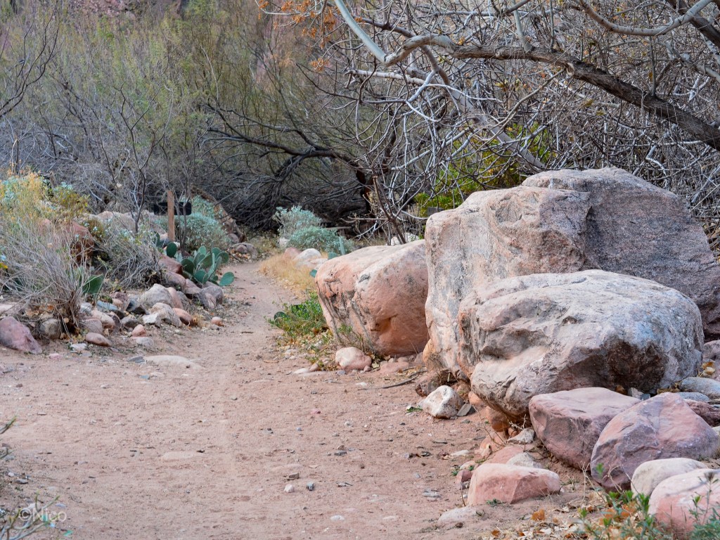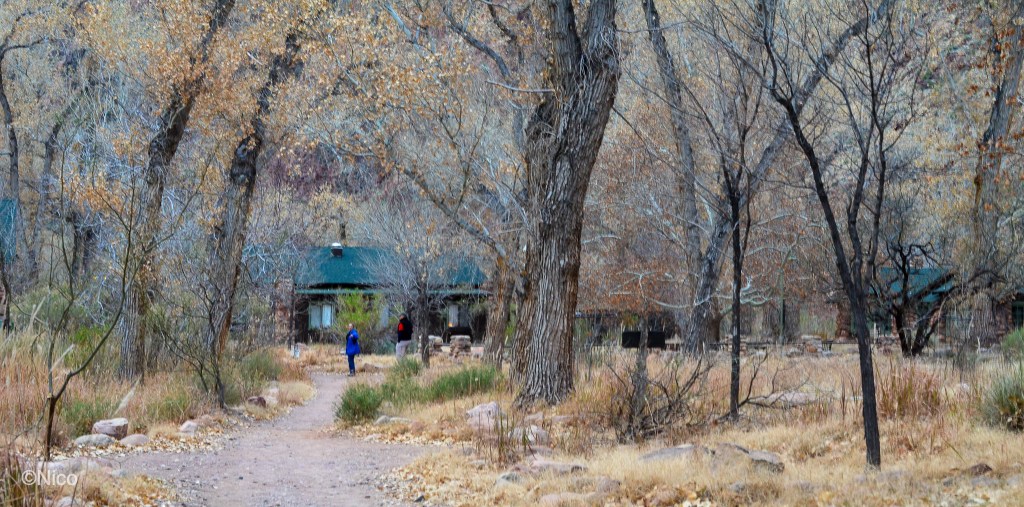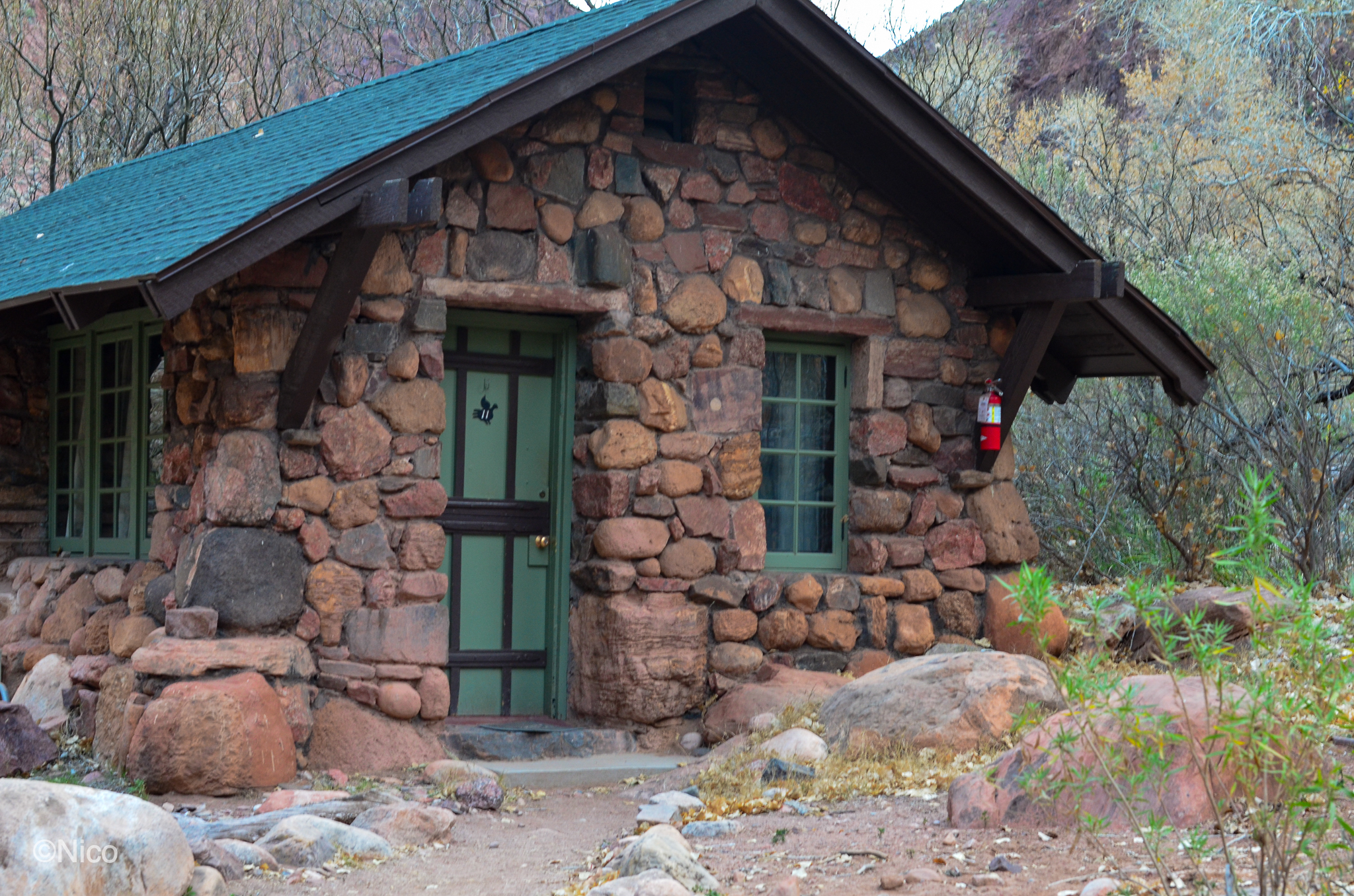 Our cabin at Phantom Ranch for two nights… that was The Plan. As explained in the chapter, “My Dinner with Jeff,” in the novel, architect Mary Colter, in 1920, specified river rocks and pinions from the forest floor as the prime building materials for Phantom Ranch. The remoteness of this place makes it difficult and expensive to bring materials down from the rims. Colter’s design has held up over the past century which contributes unique noire to this remote outpost.