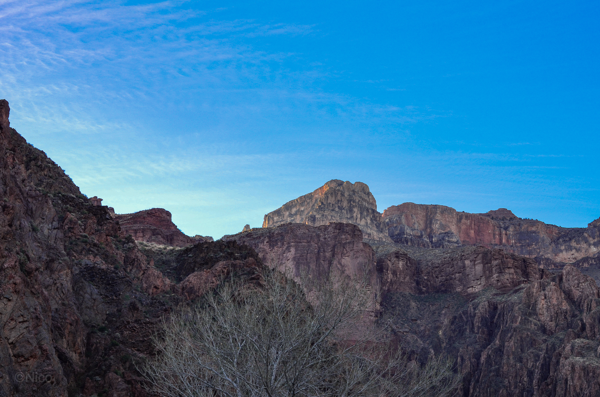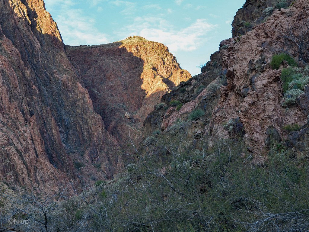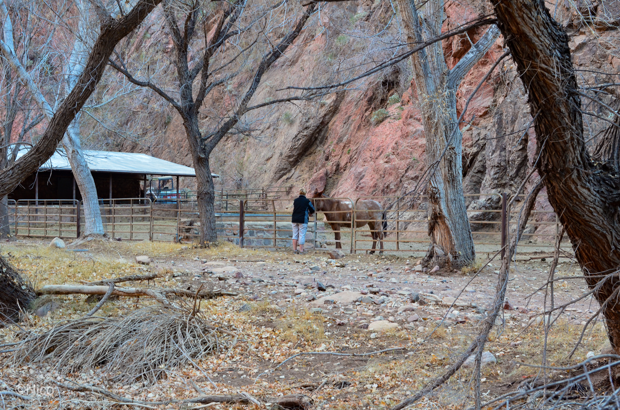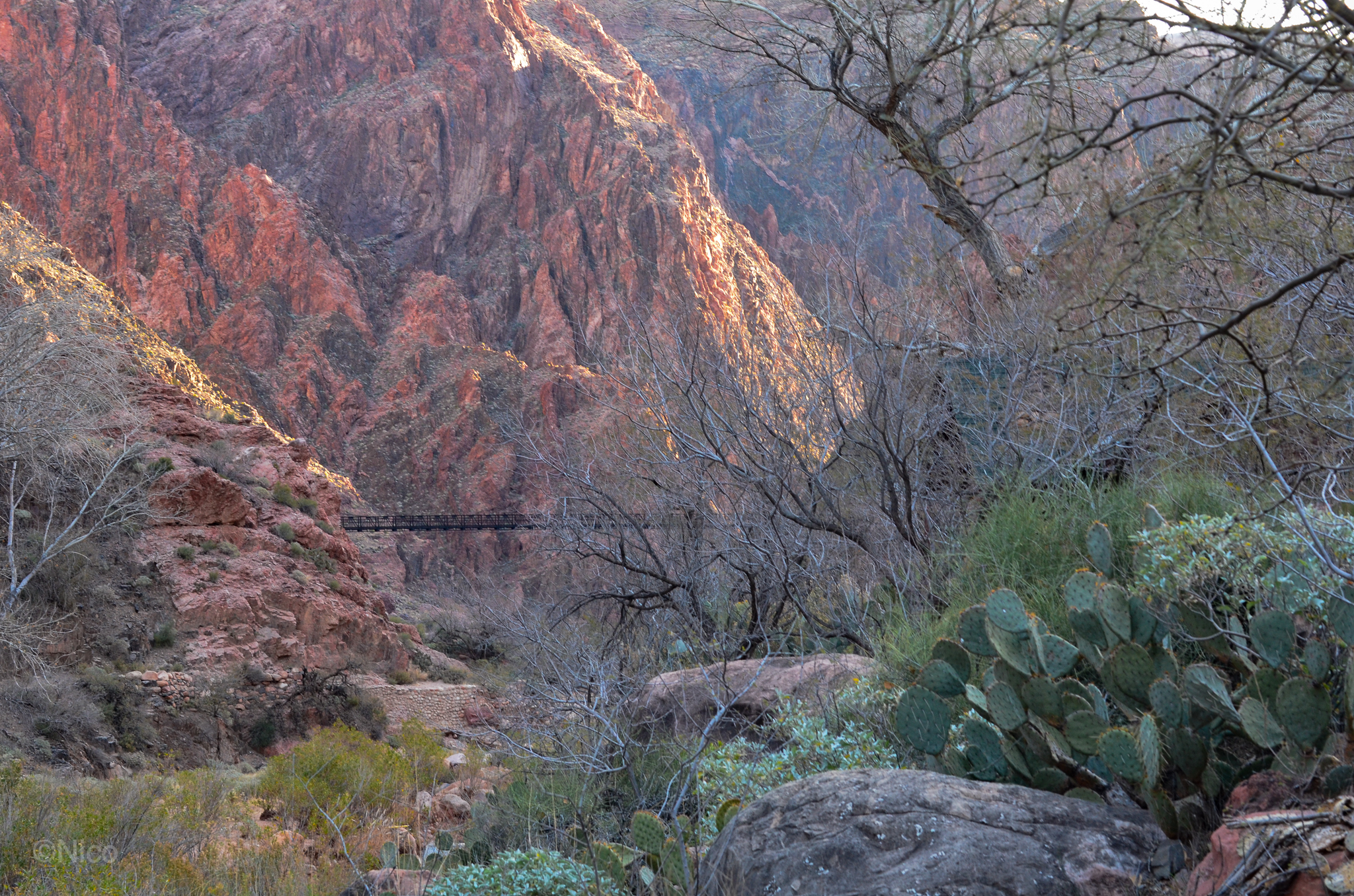 Our cabin at Phantom Ranch for two nights… that was The Plan. As explained in the chapter, “My Dinner with Jeff,” in the novel, architect Mary Colter, in 1920, specified river rocks and pinions from the forest floor as the prime building materials for Phantom Ranch. The remoteness of this place makes it difficult and expensive to bring materials down from the rims. Colter’s design has held up over the past century which contributes unique noire to this remote outpost.