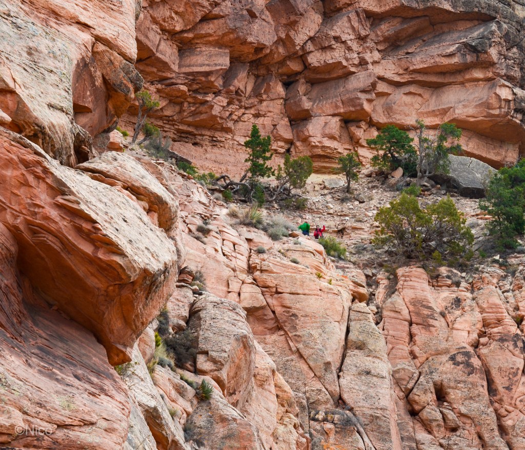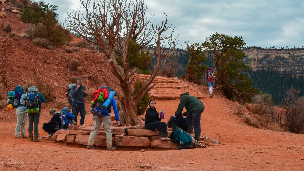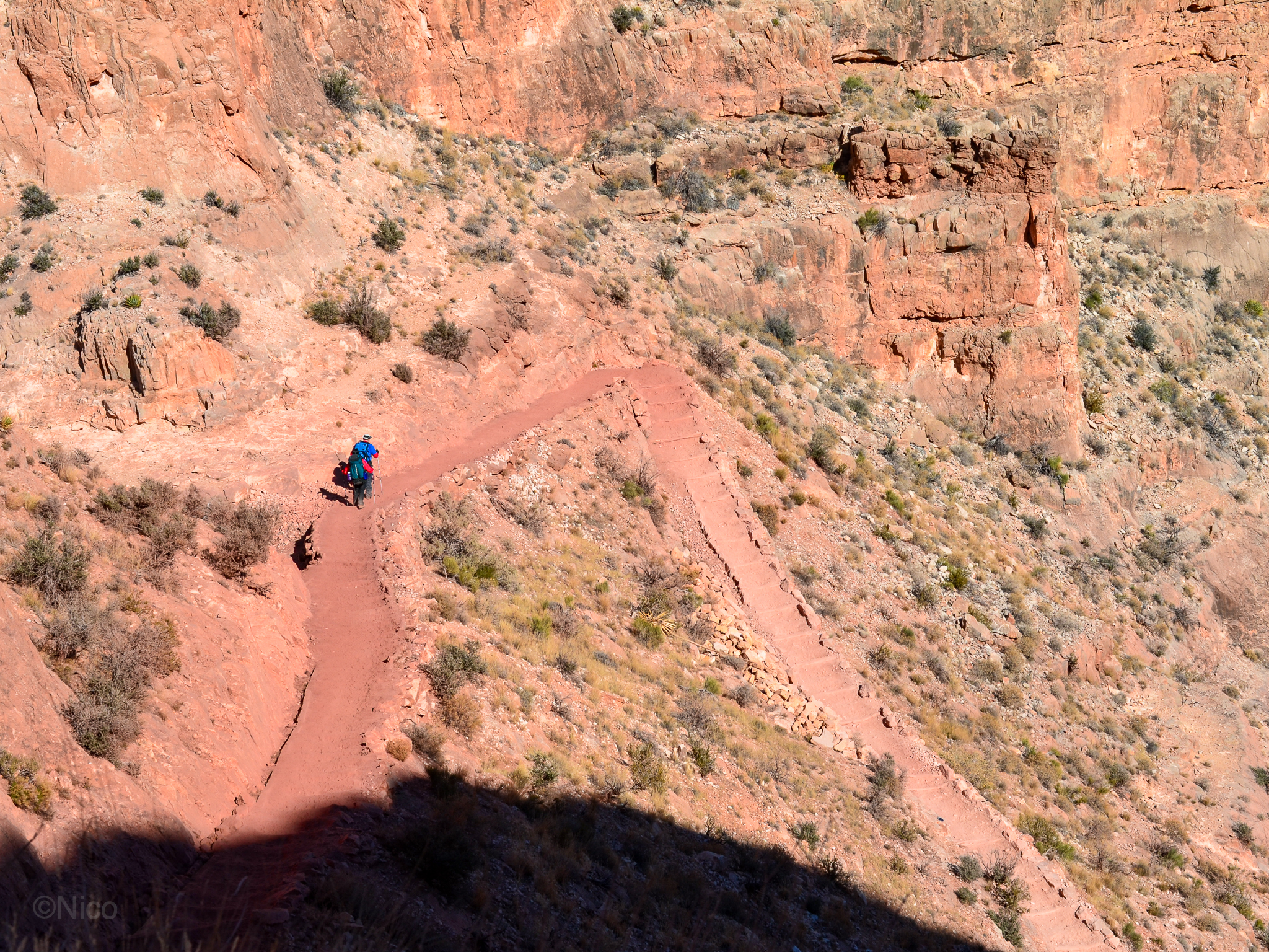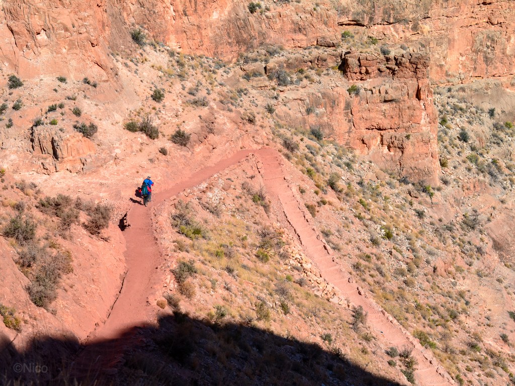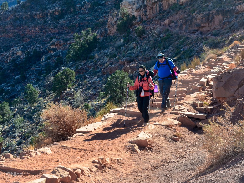 The two “pixels” are the thirty-something couple I met on the shuttle van out to the remote South Kaibab Trailhead. They became the basis for the characters, “Jim and Kate” in the book. I did not think they would make it down this rockface. Some don’t. I almost didn’t.